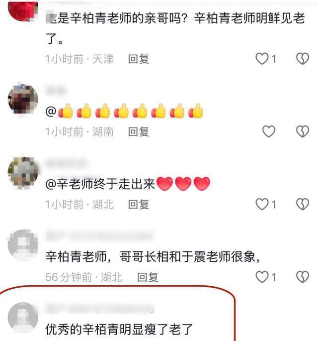 这次露面, 辛柏青的变化让人看了心疼 ,他穿得很朴素,里面套了好几件衣服,可旁边的人只穿了件单薄的外套,这么明显的对比,一看就知道他身体状态不好,透着一股气虚的样子。 再看他的脸,瘦得没什么肉感,以前那种谦谦君子的模样完全不见了,眼神空洞得没有一点光彩,整个人看起来憔悴极了, 说他比以前老了十岁甚至十几岁都不夸张 ,完全没了往日的精气神。