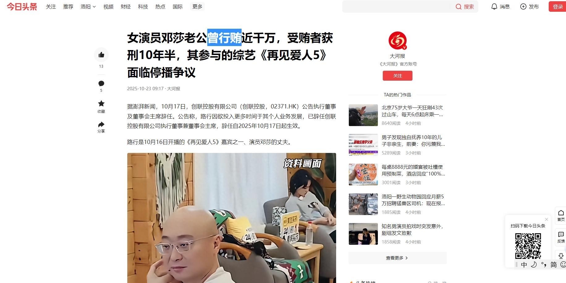 10月23日,澎湃新闻发布消息:路行因计划专注于个人事业发展,已辞去创联控股有限公司执行董事及董事会主席职务,辞职自2025年10月17日起生效。